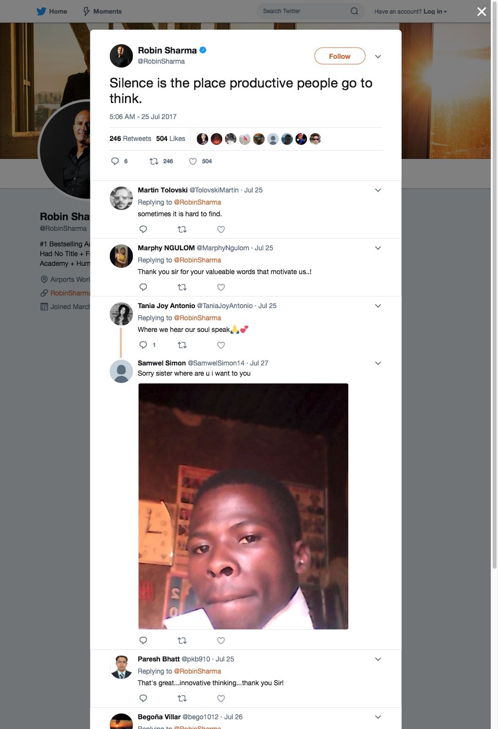 Silence is the place productive people go to think.— Robin Sharma (@RobinSharma) July 25, 2017